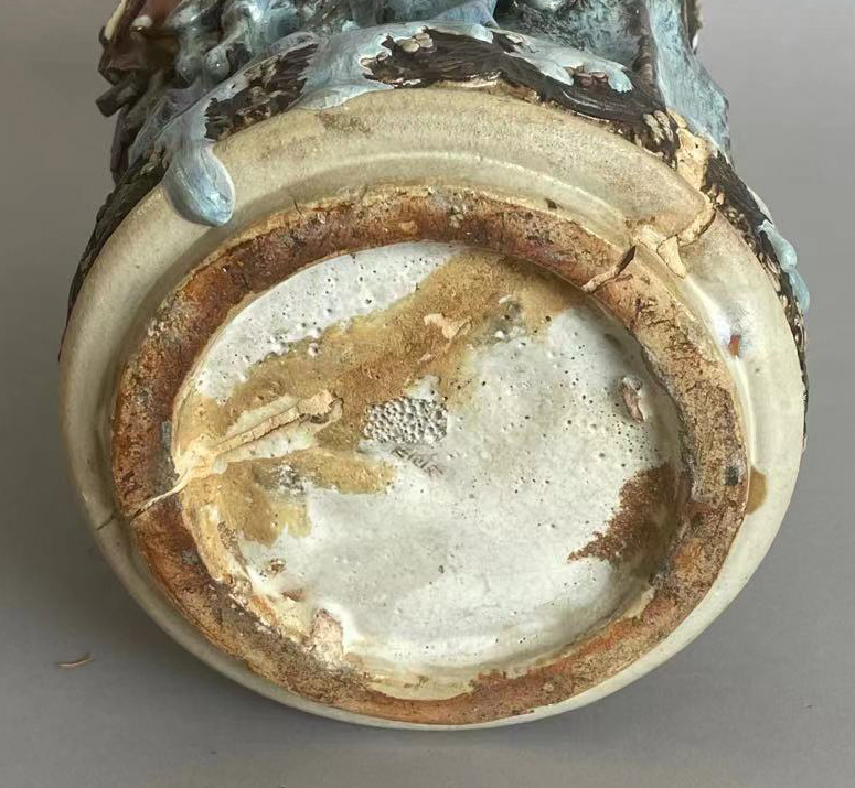 彩釉浮雕松下對奕, 喜上梅梢花插 無款 清代晚期 Flower Vases carved in relief with playing chess under the pine tree and magpies on blossoming prunus in Polychrome Glaze No mark Late Qing dynasty H:45, D:20 cm