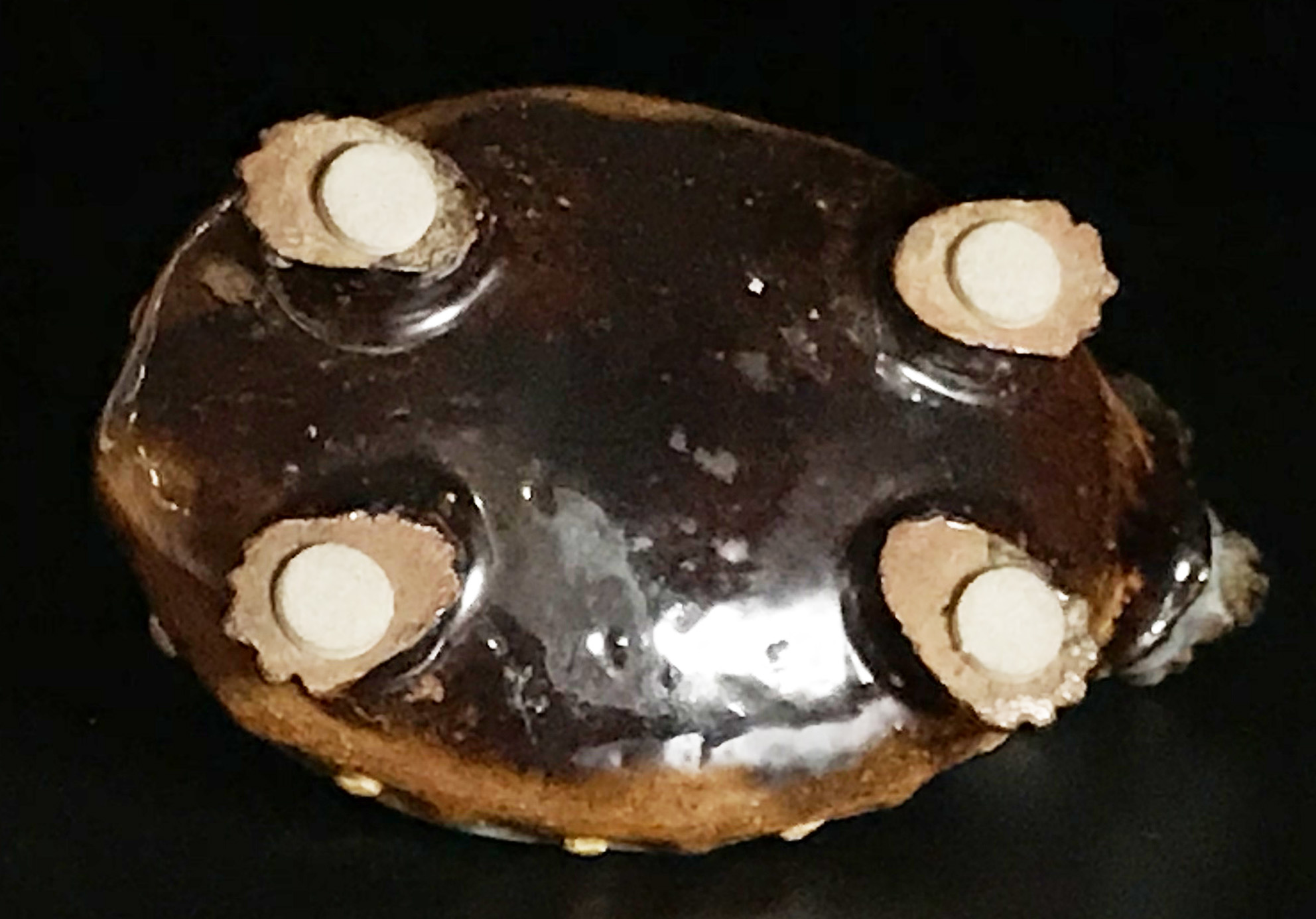 龍龜水注 袁湖記出品 二十世紀初 無款 Water dropper in the form of a Dragon-Turtle Mythical Creature. Yuen Yu Ji-type glaze Early 20th century No mark L 11 cm, H 5 cm [龍龜水注] 由於〝龍龜〞與〝榮歸〞 同音,龍龜也代表「衣錦還鄉,榮歸故里。也可助業績蒸蒸日上,財源廣進,榮譽歸來(榮歸)。