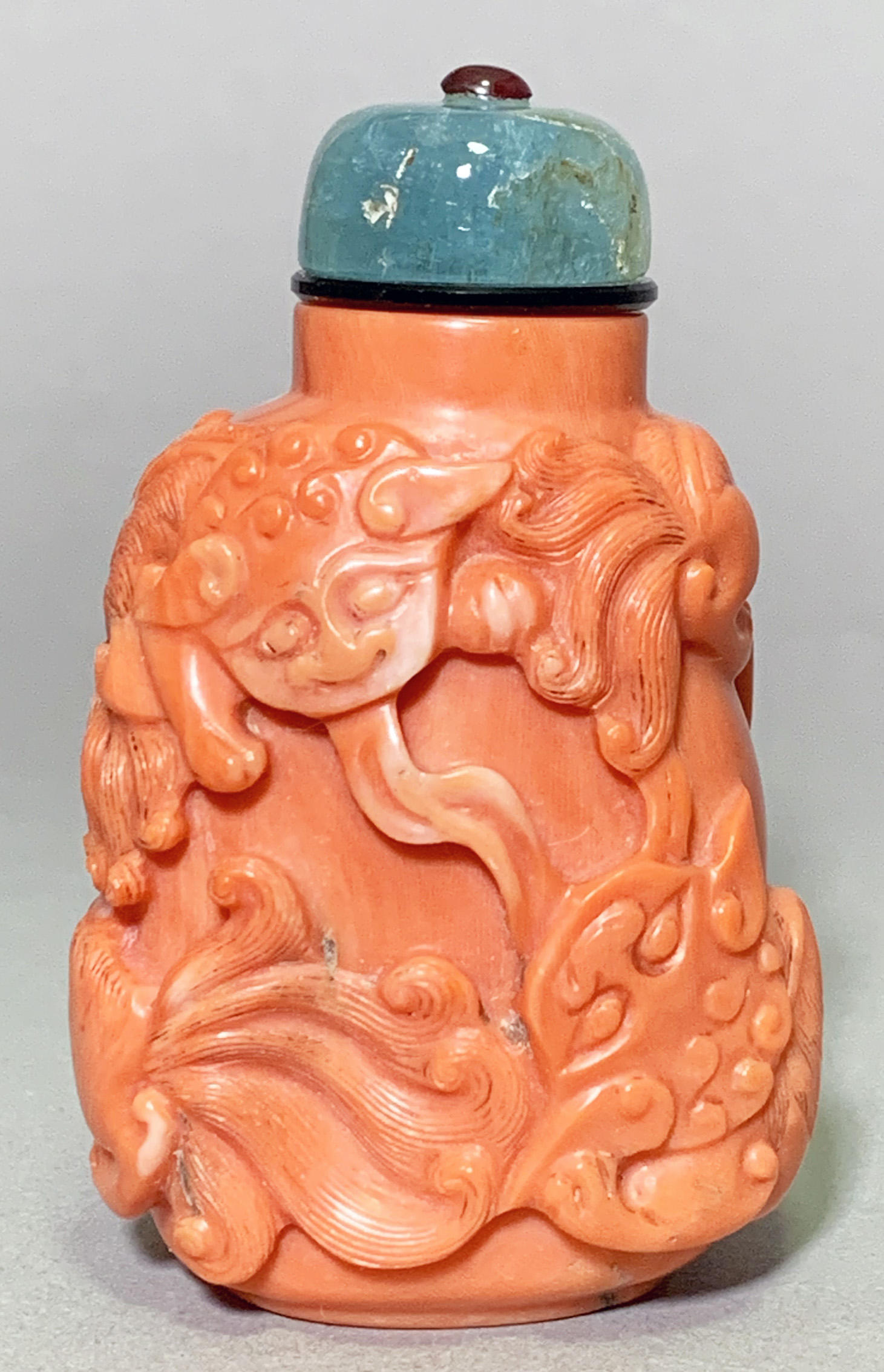 珊瑚刻群獅戲球煙壺 十九世紀 A coral snuff bottle carved in the round with lions playing with a ball 19th century