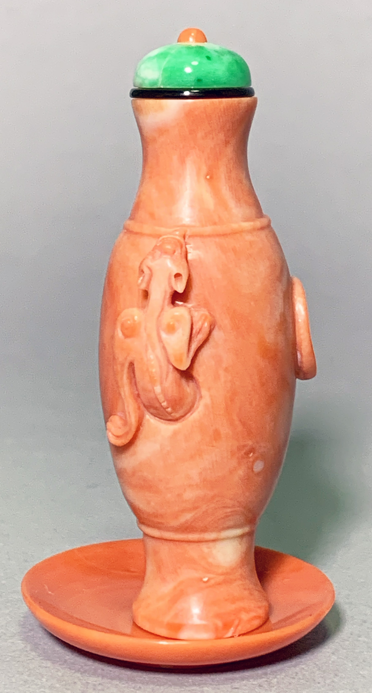 A coral snuff bottle carved with a chi-dragon climbs through the middle of the body.