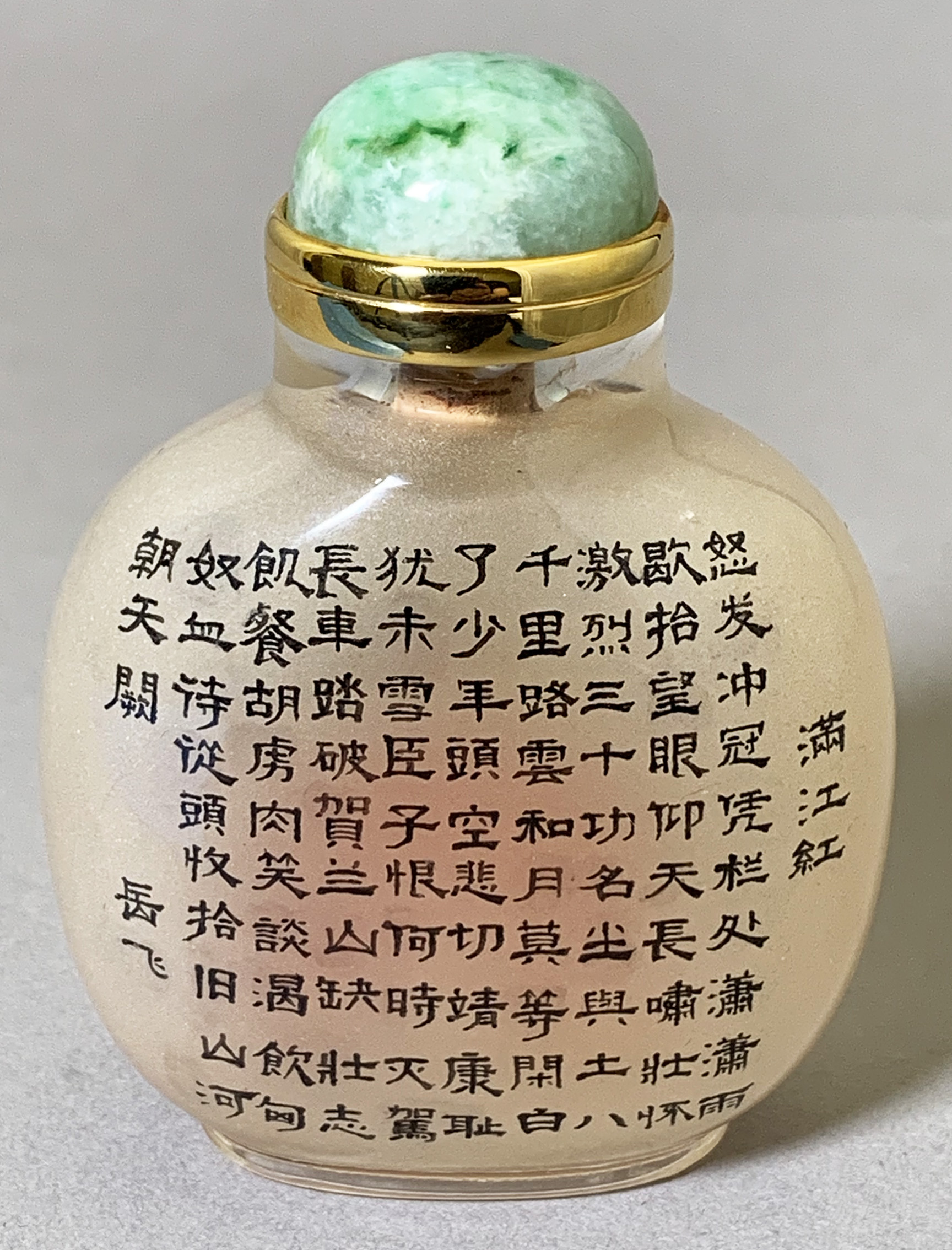 Rock Crystal, painted on the inside, on the front, with a portrait of the Song hero General Yue Fei, and on the other side inscribed with his ninety-three character poem, titled, The Reddened River, incised on the foot, Jiwu year, Xingyouhengtang (Hall of Constancy). Attributed to Liu Siu Bun , C.1966-1970. The bottle Jiawu year 1834H 5.8 cm (Excluding stopper)