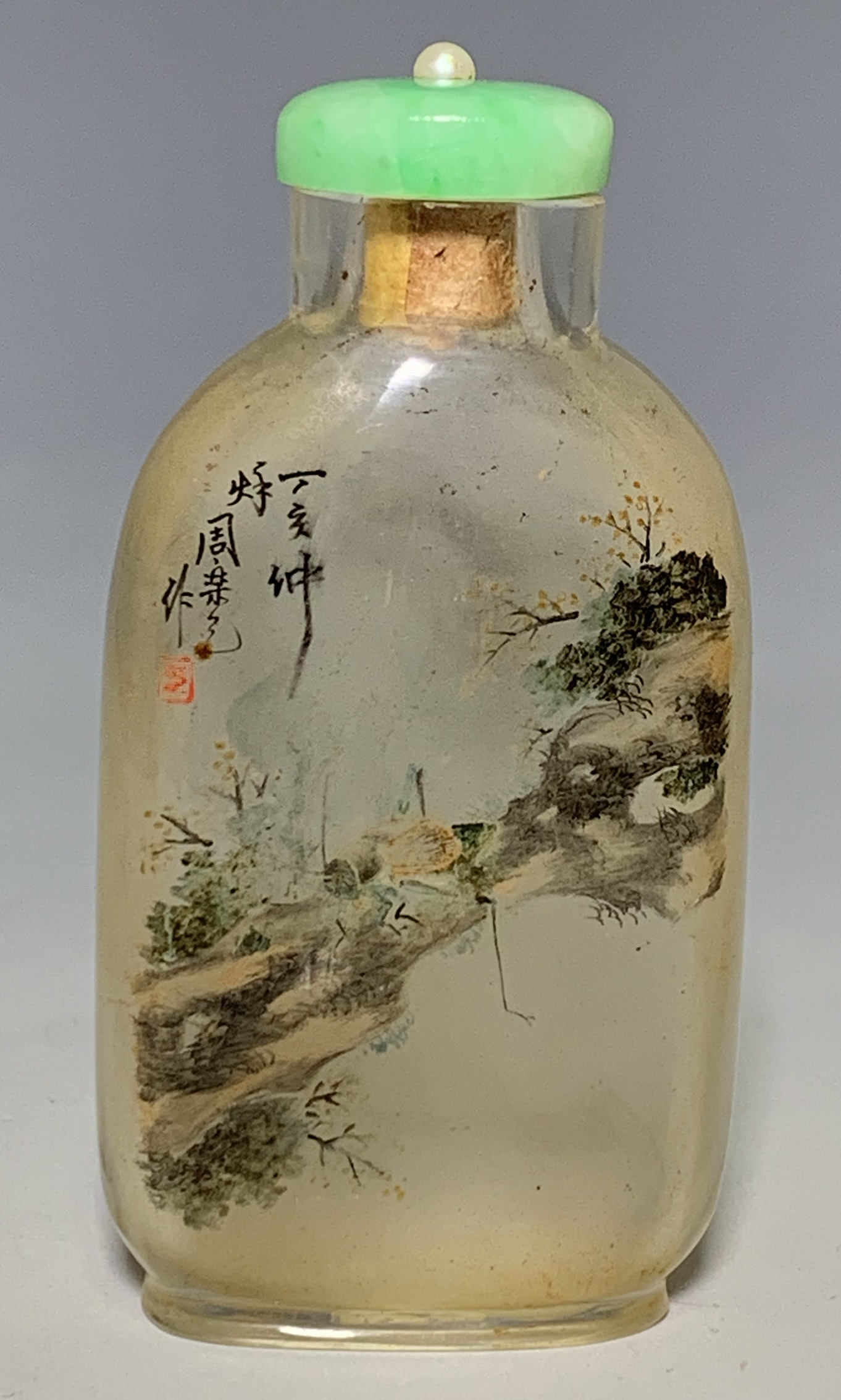 Inside Painted Glass by Chou Leyuan. A cicada resting on a mossy bank. A figure in a boat, beneath towering misty mountains