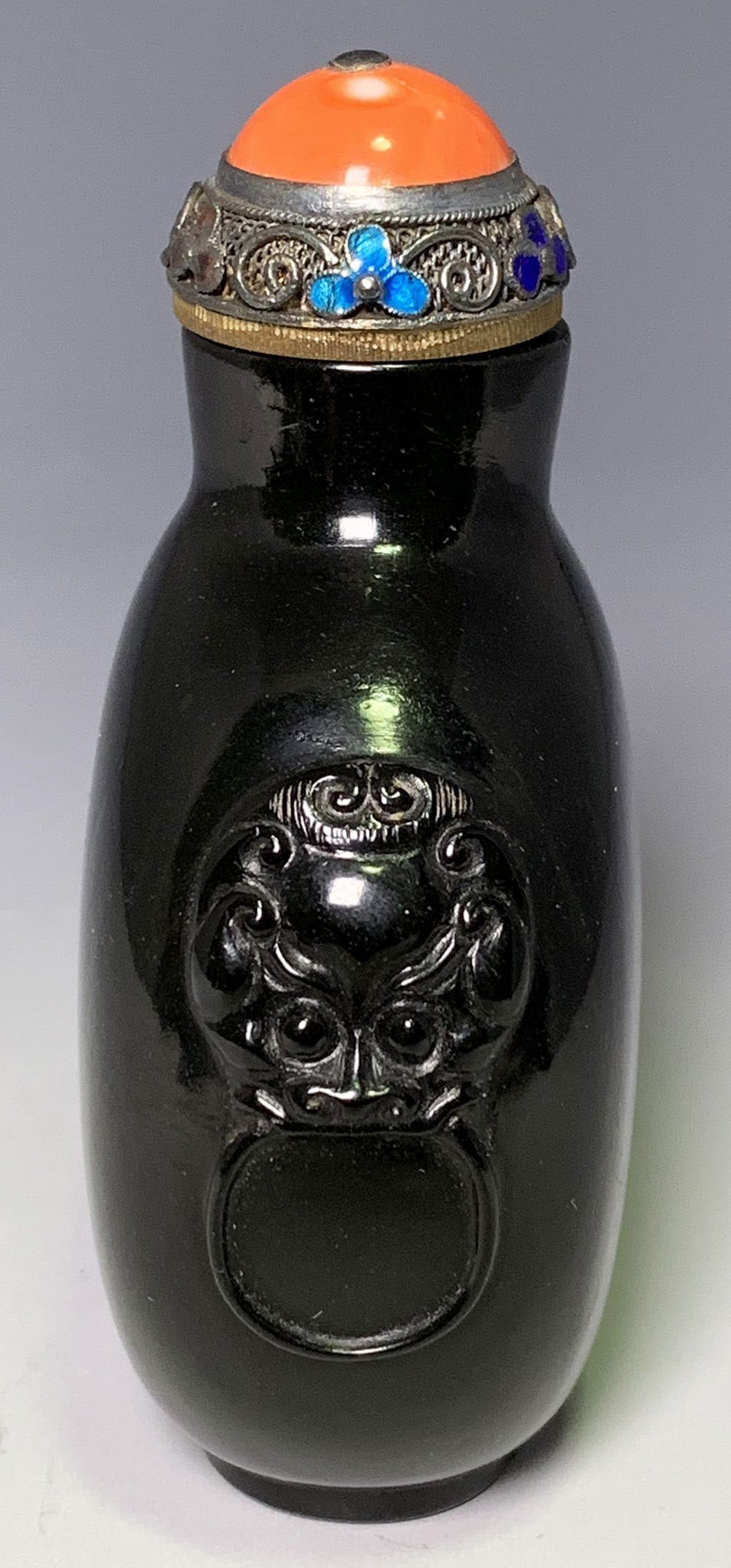 Jet; of ovoid form with oval ringed foot; the shoulders carved with mask and ring handles. Mark of "Mao Chang Tang".