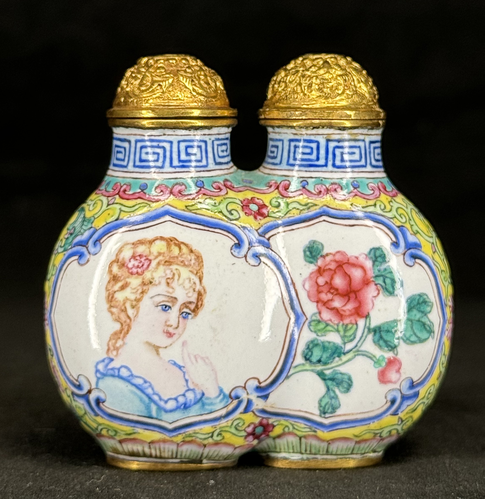 銅胎琺瑯彩西洋士女雙壺 近代, 「乾隆年 製」款 Enamel paint on copper body with western ladies twin bottles Modern Qianlong mark in blue enamel H 4.4 cm (Excluding stopper)