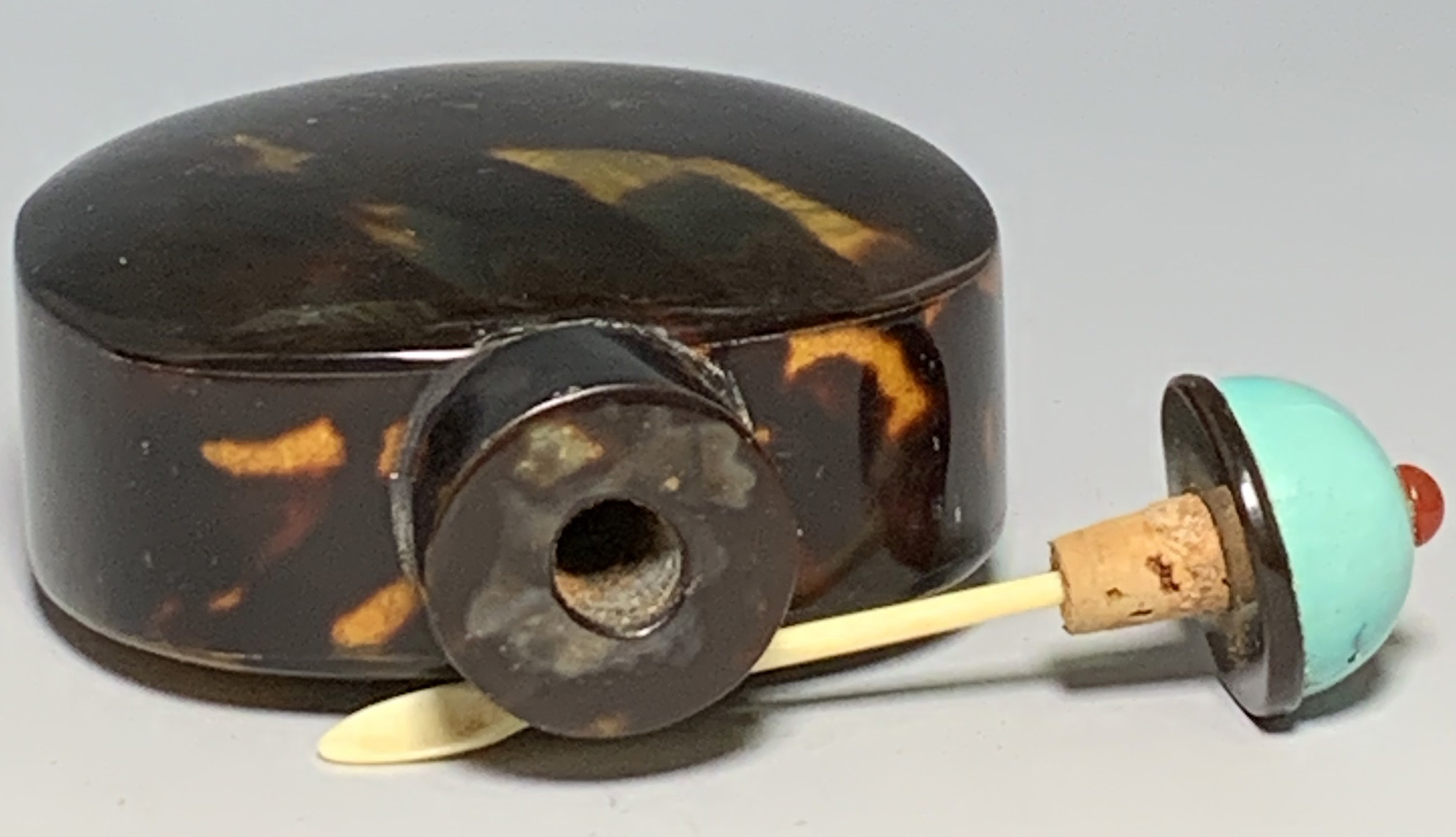 玳瑁煙壺 相信以木作框, 各面黏貼上玳瑁片而成, 由於玳瑁質輕而半透明, 方便用者從外看到鼻煙餘量. 二十世紀初 |