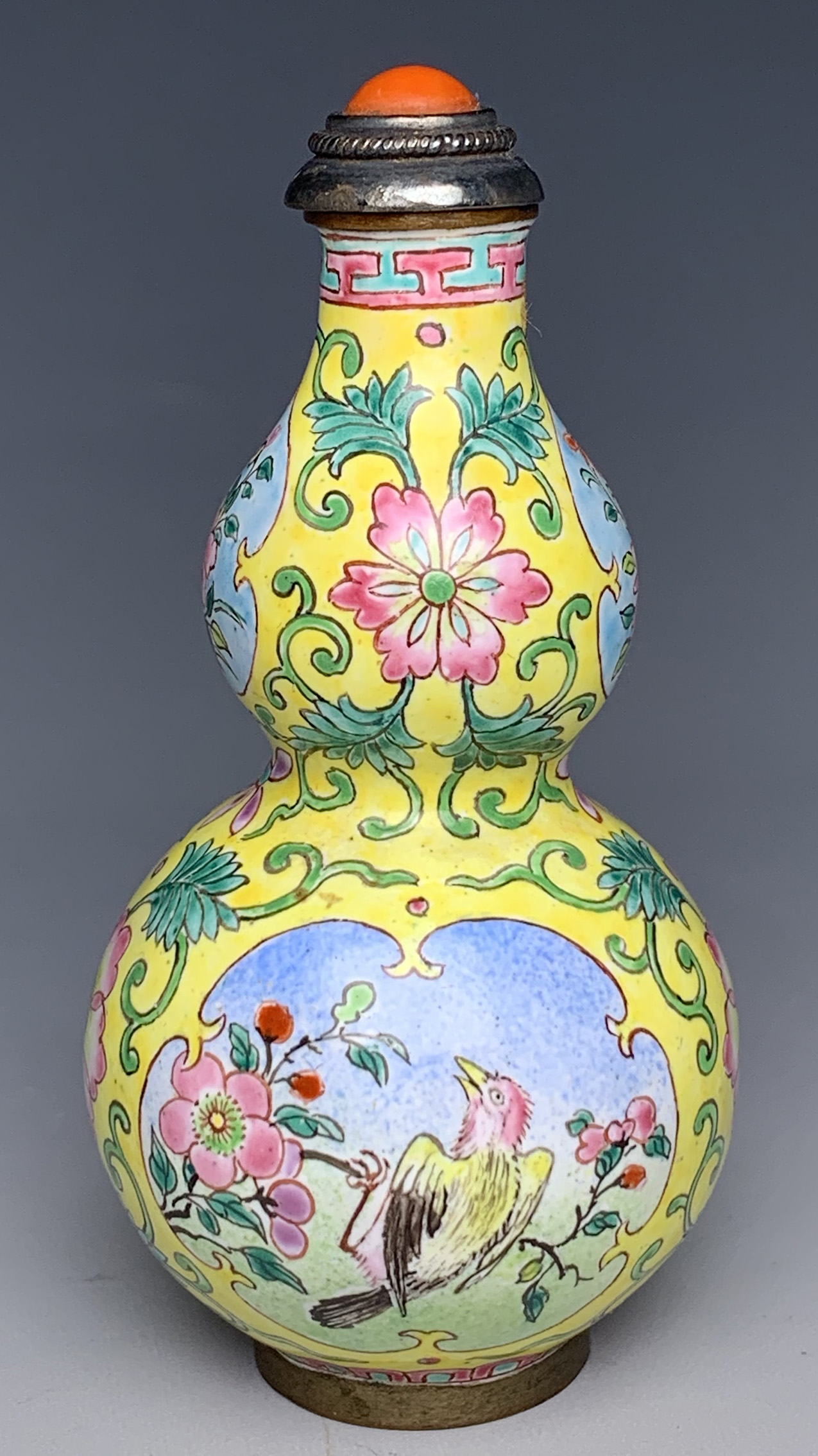 Painted enamel on copper double-gourd shape bottle.