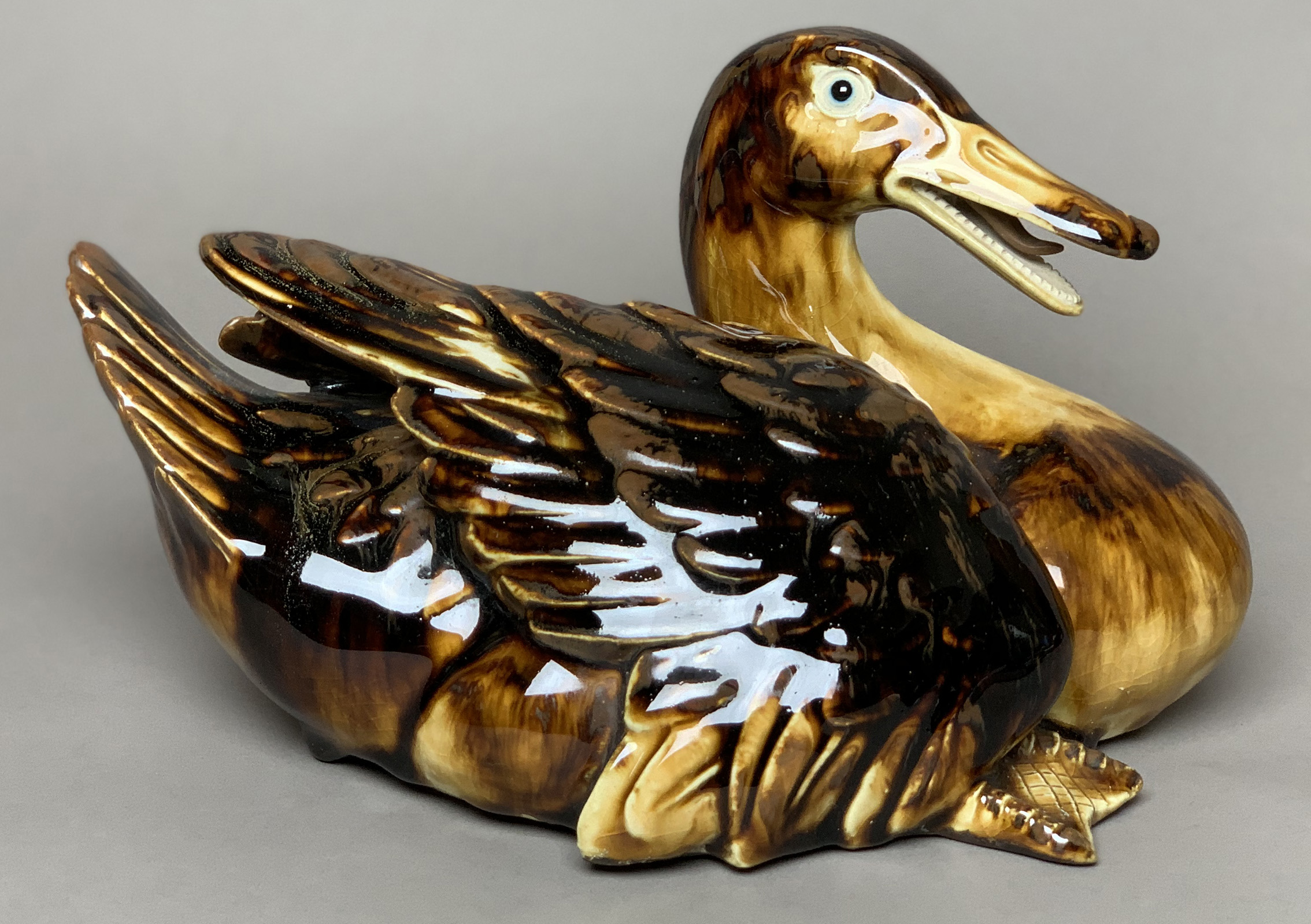 鴨, 醬釉 70 年代 "石灣名陶" 印, 評為曾良作 W 23.5 cm Duck in Brown glaze 1970s Mark of "Shi Wan Ming Tao"(Shiwan Pottery), attributed to the works of Zeng Liang