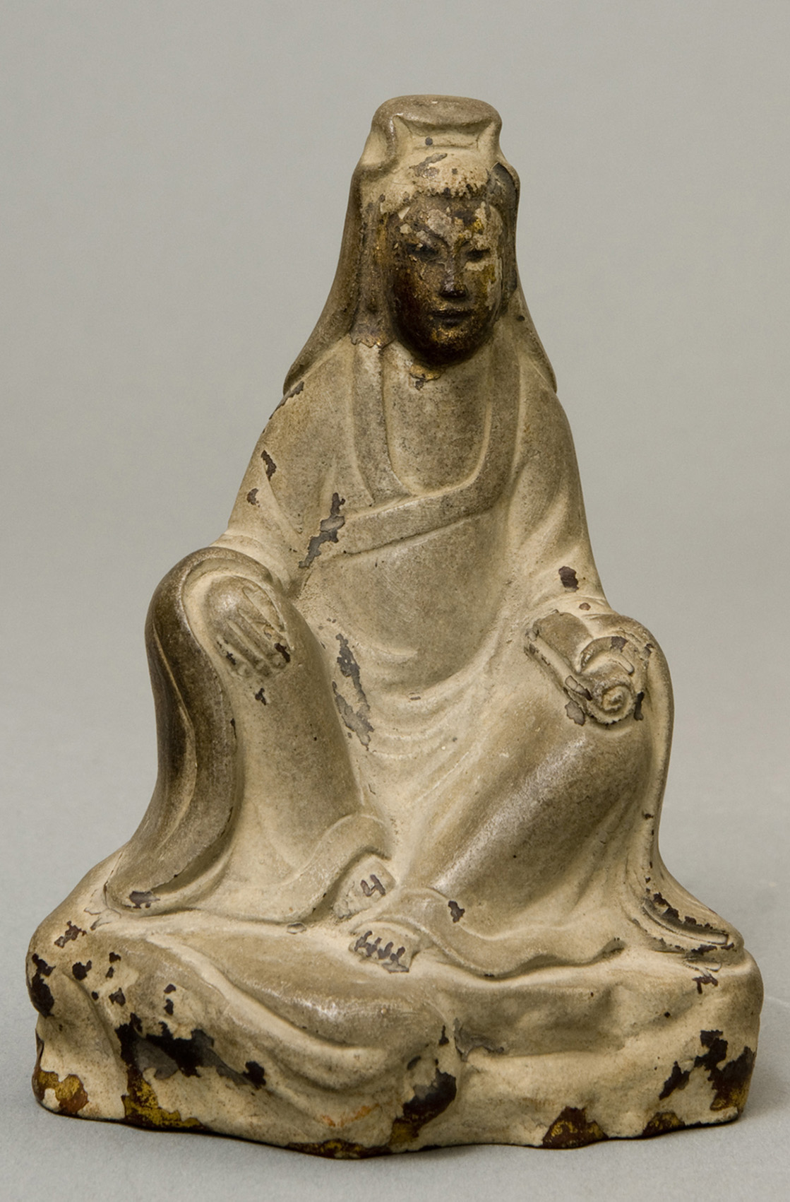 貼金觀音連木座 無款 明或清初 Guan Yin, once affixed with gold foil. With wooden stand. No mark Ming or early Qing dynasty H 11.3 cm (ex. stand)