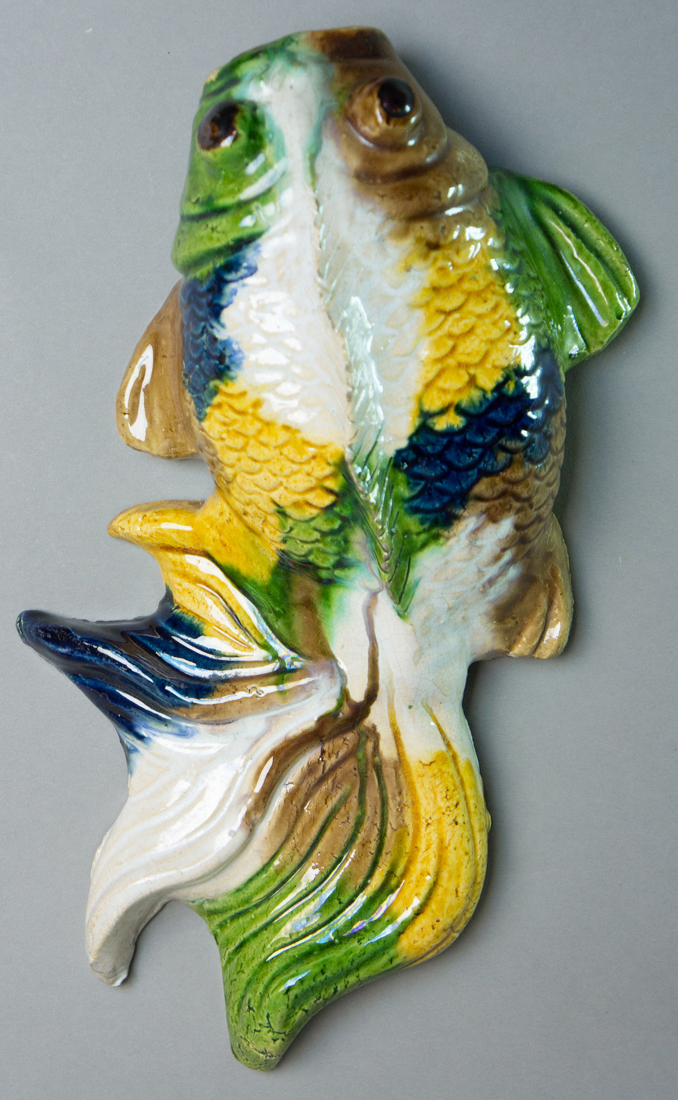 金魚掛壁 上世紀40年代 「石灣利生號製品」 陰紋印 評為廖滄作 廖洪標簽款 H 27 cm Gold fish shape Wall hang vase 1940s Mark of “Shiwan Li Sheng Hao zhi pin” in intaglio Attributed to work of Liao Cang. Inscription by Liao Hungbiao