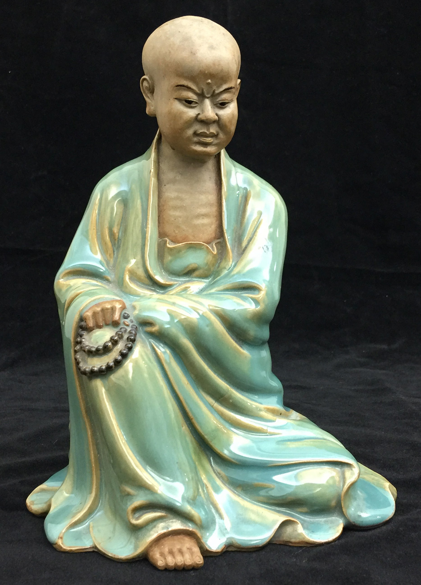 女尼 “渭岩” 刻款 此作被認定為霍勝臨摹陳渭岩原作女尼, 照片見於《石灣藝術陶器》; 《中國石灣窯》#182 . A Nun Inscribed with “Wei Yan” . Originally work of Chen Weiyan (Ref book "SHIWAN ART POTTERY"p. 70, and "Shiwan Kiln Of China" #182). This one copied by Huo Sheng. H-23cm
