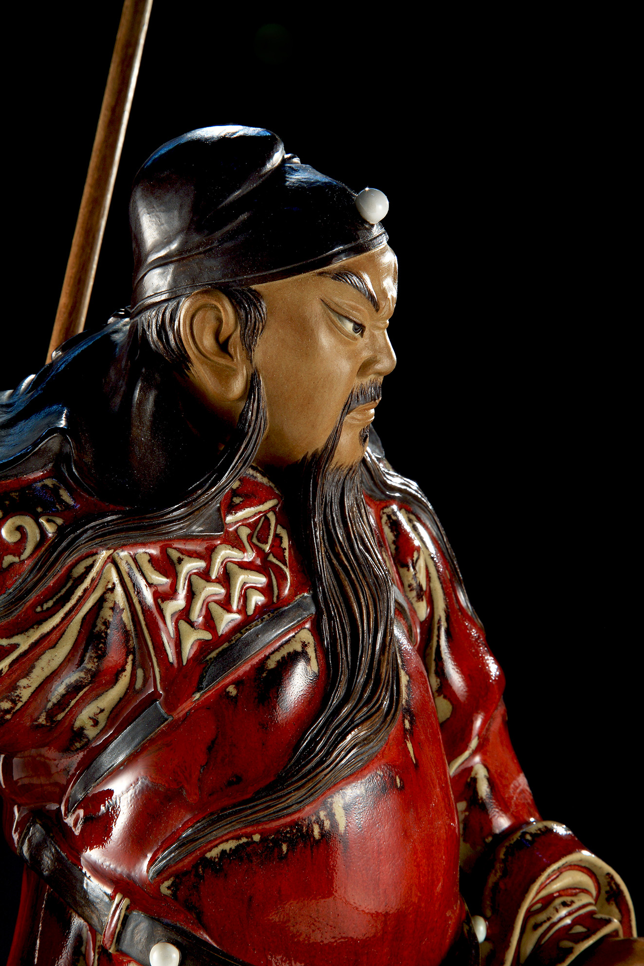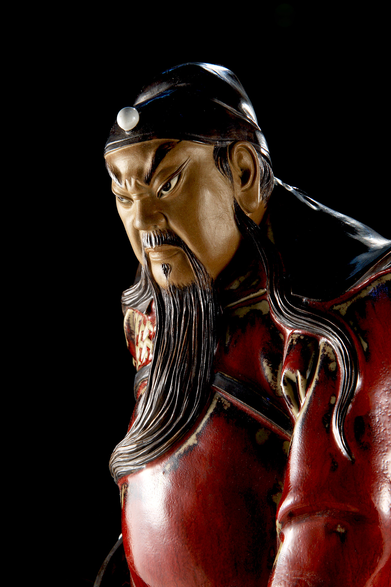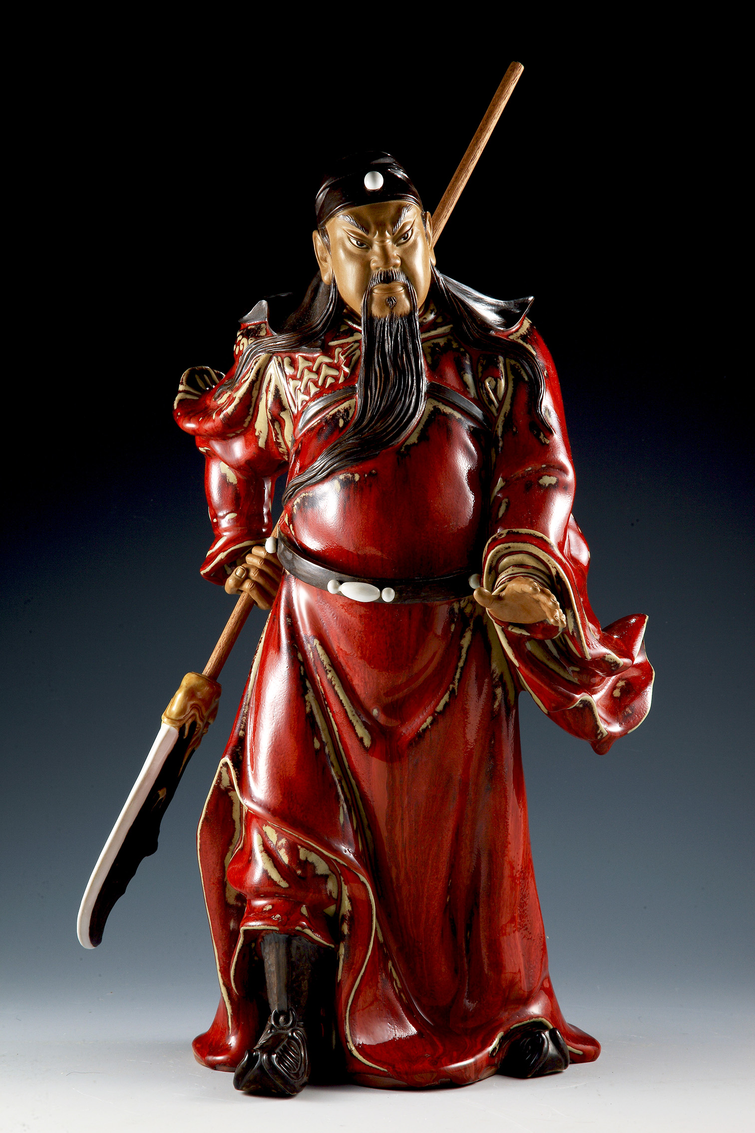 Guan Yu, with the style name Guan Yunchang, was a great general of the Kingdom of Shu Han, one of the Three Kingdoms. In the late Eastern Han Dynasty, Liu Bei, Zhang Fei and Guan Yu became sworn brothers and they vowed to live and die together and to serve the Han court. In feudal China, Guan Yu had been regarded as a role model of “loyalty and righteousness”. The title Marquis of Shouting of the Han Dynasty was granted to him, and he was bestowed posthumously the title Wu Sheng Di Jun (Saintly Emperor Guan of War) (See Note 1) A man of loyalty and righteousness, he has been greatly respected by the mass and overseas Chinese since the Song and Yuan era. He is regarded as the personification of righteousness and worshipped as a deity with the title of “Saintly Loyal Righteous Kind and Courageous Emperor Guan”. In the novel Romance of the Three Kingdoms, there is a description of the physical appearance of Guan Yu: a person at a height of nine chi (a traditional Chinese unit of length, approximately equal to one foot), with a long beard hanging over his belly. His face was of the color of a zao (Chinese date) and his lips were so red that they seemed to have been polished by rouge. His eyes were like those of a phoenix’s and his eyebrows resembled silkworms. He was wearing a green head cloth and a green robe. He had a dignified aura and looked quite majestic. There are countless statues of Guan Yu in China. Liao Hongbiao is recognized as the “King of Guan Yu”, because his works of Guan Yu have a particularly imposing appearance – looking powerful, Guan Yu is not only a magnanimous and loyal general but also embraces scholarly temperament. Liao is apt at making use of the beauty of the strength of Guan Yu’s body structure to present the hero’s qualities of “loyalty, righteousness and courage”. This standing statue of Guan Yu of 18 inches by 28 inches in dimensions depicts the episode of the general attending single-handed the banquet hosted by Lu Su. (See Note 2). This is an episode in which Guan gets closer to Eastern Wu, another kingdom of the Three Kingdoms, and it goes on the stage earlier than the one where Guan becomes one of the Five Tiger Generals. Guan is holding his weapon, the Green Dragon Crescent Blade, in his right hand, and showing his left hand. He is about to start a debate with his opponent and he wants to try fair means before resorting to force. The Green Glaze matches the description of Guan in the novel, but more importance has been attached to the red colour in Chinese cultural tradition. This is why red-glaze statues of Guan Yu have been much adored. Green Dragon Crescent Blade in his right hand at his back. With the blade facing backward, he is a warrior in a poise from which he is ready to resort to force at any moment. The implications are easy to understand – if my opponent takes any action, I’ll move faster than him; if his tries to strike me or rob anything from me, I’ll cut him into two pieces without hesitation. With rising eyebrows and bright piercing eyes, Guan reviles Zhou Cang angrily but he is actually striking at Lu Su and his colleagues. He insinuates that the Eastern Wu officials including Lu Su should not commit any rash acts – if they want to take forcible possession of Jing Zhou, a place of great strategic value, they should first destroy him, a man of lofty sentiments and high aspirations. With his toes pointing outwards, Guan stands upright in the Linjiang Pavilion (the pavilion by the bank of the Yangtze River). Pretending that he is drunk, he is using his wisdom and ready to resort to his martial talents to handle the difficult situation. Only great heroes have such qualities of loyalty, righteousness and courage.