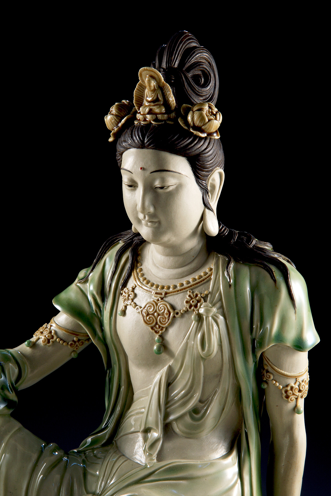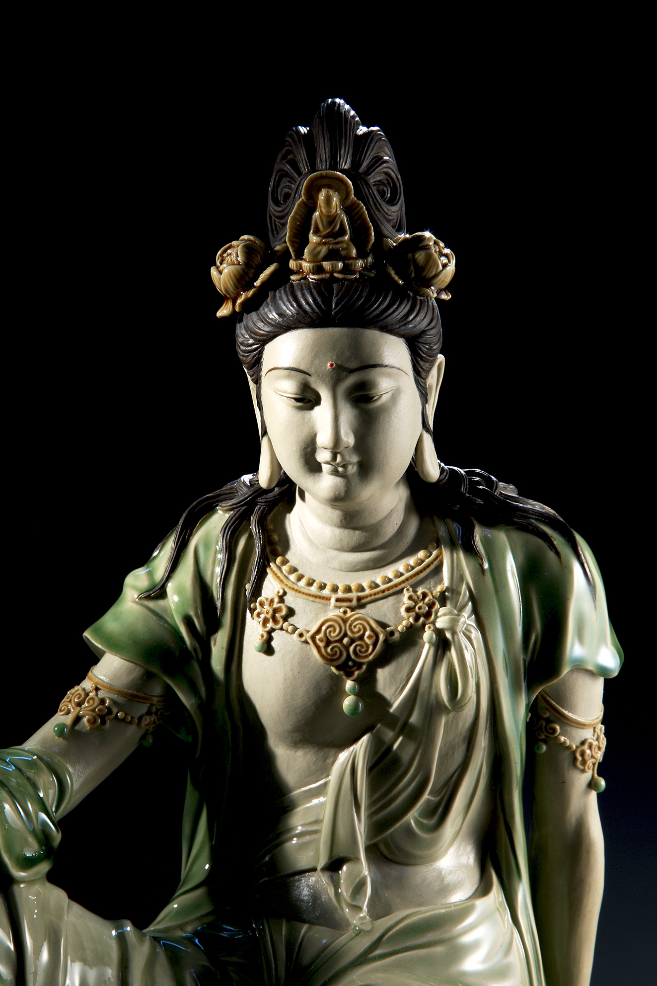 With the intention to differentiate “Guanyin” from the works of the deity made with extra care, Liao produced the original work of “Guanyin””with a bigger size, a more solemn expression and a sitting poise at a higher level. Details of the accessories such as necklaces of jade and pearls, arm bracelets and wrist bracelets have also been slightly changed. Three lines instead of two lines are found on the neck. More straight lines are found on the drapery. By making the above changes, a sense of solemnity is injected into the calm-looking original work of “Guanyin”.