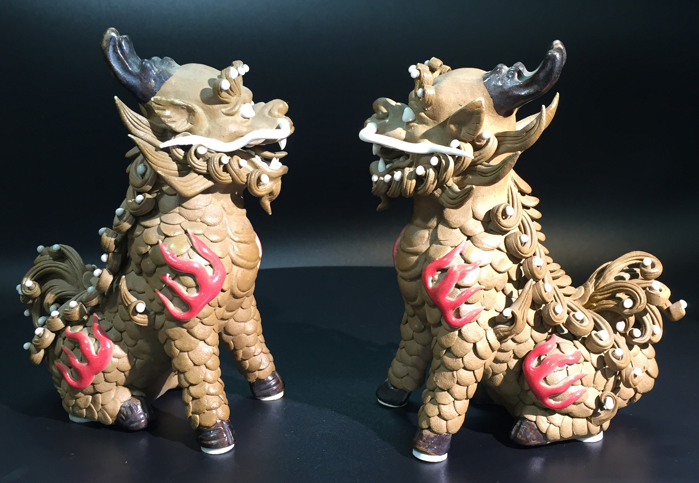 胎色麒麟獻瑞、威鎮四方一對 霍然均于2013年創作 分別手刻款:麒麟獻瑞 霍然均原作;威震四方 然均原作 高13 cm,寬5.5 cm,厚9 cm 麒麟乍見,蓬萊清淺。