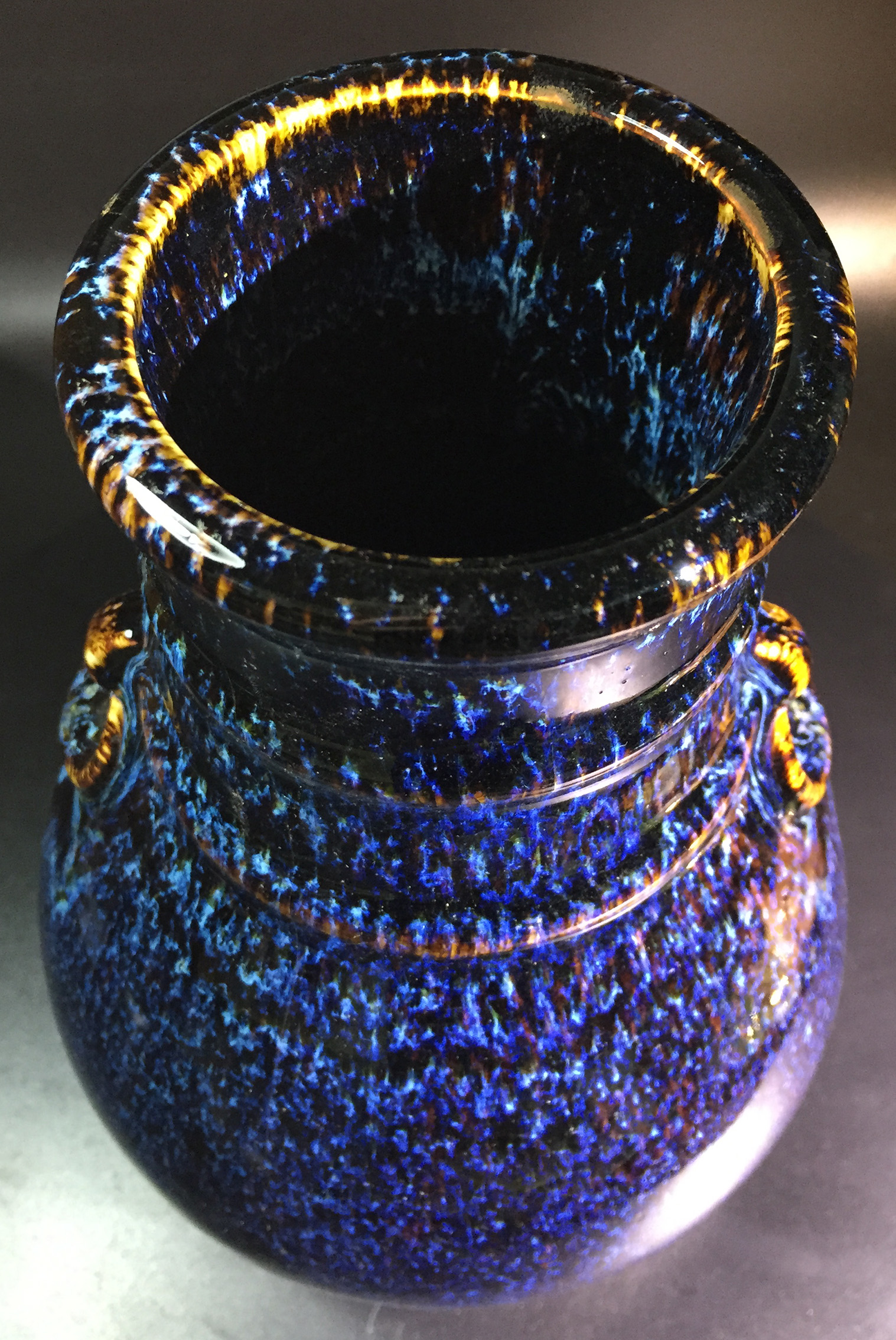 藍鈞釉弦紋環耳瓶 劉澤棉于上世紀60年代創作 鈐「CHlNA」款。 劉澤棉大師鑒定並簽署。 高23 cm,口徑8.5 cm,腹徑16 cm Vase with string pattern and ring handles in blue transmutation glaze 1960s Confirmed by Liu Zemian.